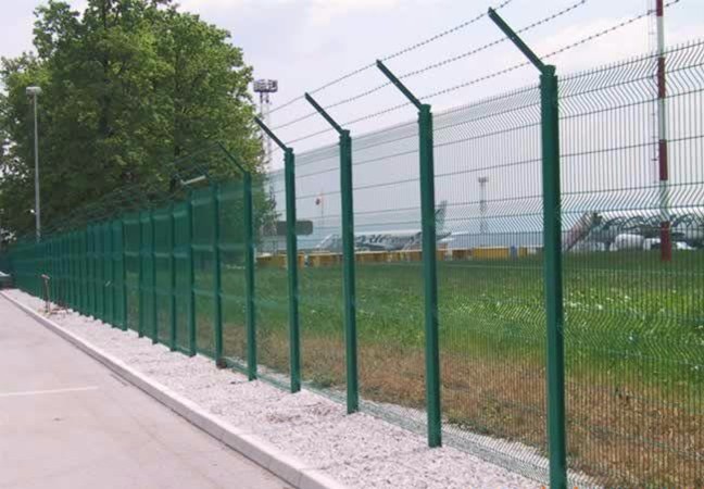 機場圍欄又稱作“Y型安全防御護網(wǎng)”,是由V型支架立柱,加強型焊接網(wǎng),安全防盜連接件和熱鍍鋅刀片刺籠組成強度和安全防御性級別很高。機場刺絲防護網(wǎng),被廣泛應用在機場,軍事基地等高安全場所。機場刺絲防護網(wǎng)頂部加裝刀片刺絲、刀片刺繩后又很好的增強了安全防護性能。采用電鍍、熱鍍、噴塑、浸塑等防腐形式,具有很好的抗老化、抗曬、耐候等特點。機場圍欄造型美觀、花色多樣,既起到圍欄作用,又起到美化作用。由于具有安全性高、防攀爬能力好,網(wǎng)片連接方式采用特制SBS緊扣件,有效防止人為的破壞性拆卸,橫向四道折彎加強筋,使網(wǎng)面強度顯著增加。