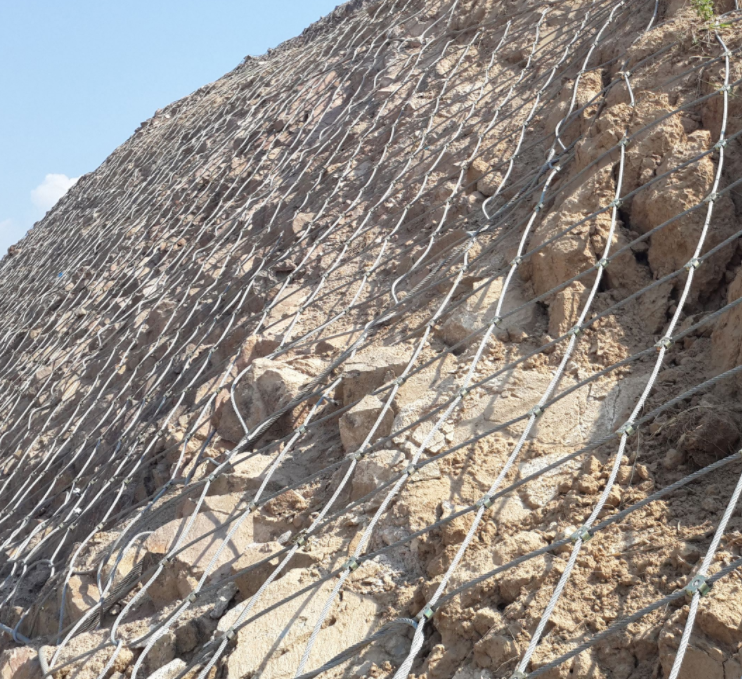 主動邊坡防護網是以鋼絲繩網為主的各類柔性網覆蓋包裹在所需防護斜坡或巖石上,以限制坡面巖石土體的風化剝落或破壞以及為巖崩塌(加固作用),或將落石控制于一定范圍內運動(圍護作用)。被動防護是由鋼絲繩網、環形網、(需攔截小塊落石時附加一層鐵絲格柵)、固定系統(錨桿、拉錨繩、基座和支撐繩)減壓環和鋼柱四個主要部分構成。鋼柱和鋼絲繩網連接組合構成一個整體,對所防護的區域形成面防護,從而阻止崩塌巖石土體的下墜,起到邊坡防護作用。