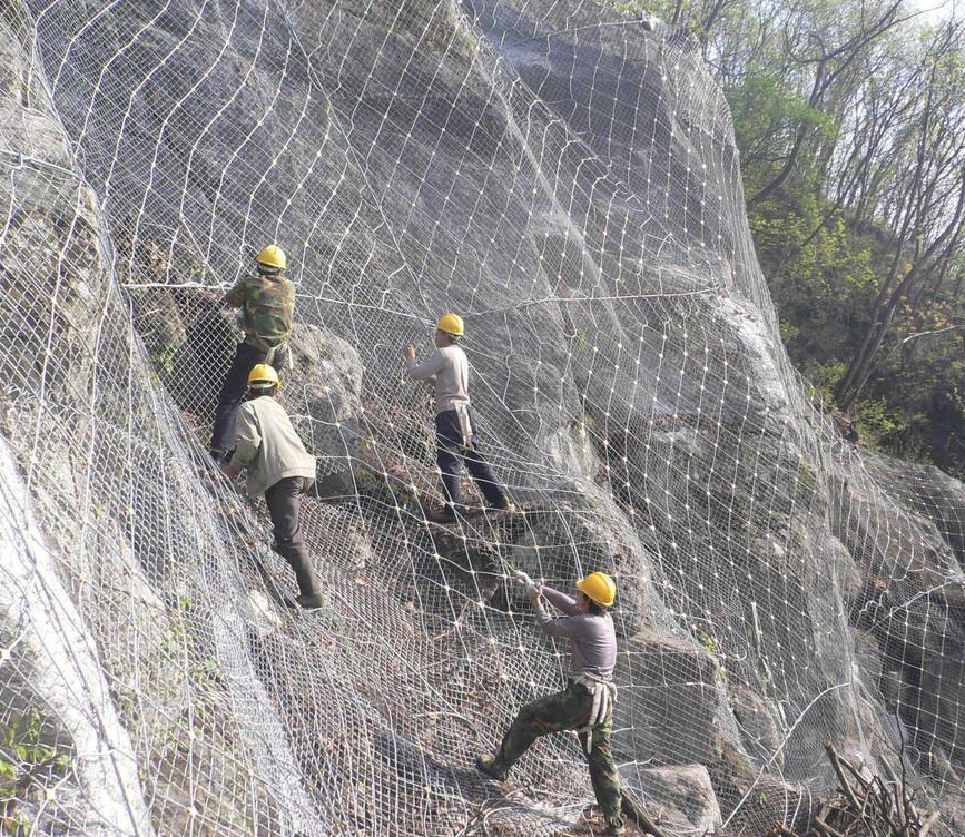 主動邊坡防護網是以鋼絲繩網為主的各類柔性網覆蓋包裹在所需防護斜坡或巖石上,以限制坡面巖石土體的風化剝落或破壞以及為巖崩塌(加固作用),或將落石控制于一定范圍內運動(圍護作用)。被動防護是由鋼絲繩網、環形網、(需攔截小塊落石時附加一層鐵絲格柵)、固定系統(錨桿、拉錨繩、基座和支撐繩)減壓環和鋼柱四個主要部分構成。鋼柱和鋼絲繩網連接組合構成一個整體,對所防護的區域形成面防護,從而阻止崩塌巖石土體的下墜,起到邊坡防護作用。