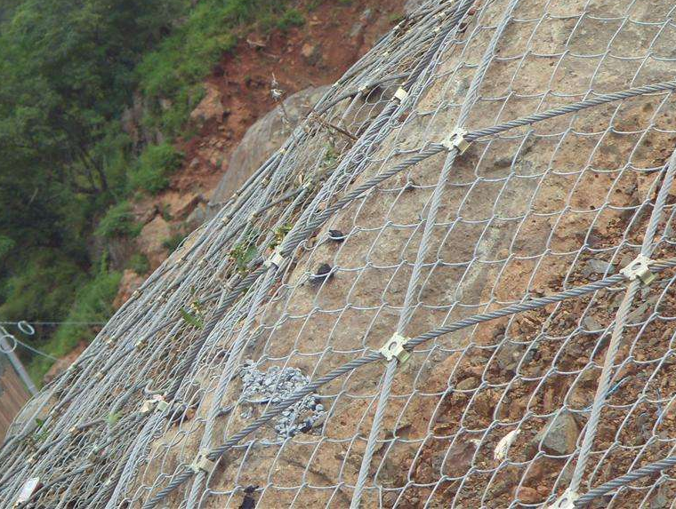 柔性邊坡防護網以高強度鋼絲繩柔性網、菱形鋼絲繩網、環形網、高強度鋼絲格柵作為主要構成部分,并以覆蓋、緊固來防治坡面巖面崩塌、滾落、爆破飛石等的危害。柔性邊坡防護網圍護作用,限制落石運動范圍,部分抑制崩塌的發生。