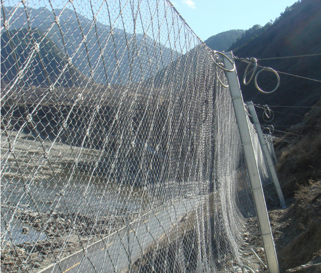 材質:鋼絲繩網、支撐繩和減壓環構造:由鋼絲繩網或環形網(需攔截小塊落石時附加一層鐵絲格柵)、固定系統(錨桿、攔錨繩、基座和支撐繩)、減壓環和鋼柱四個主要部分構成。