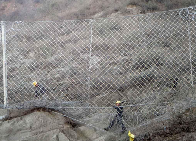 被動邊坡防護網的特點在于:系統的柔韌性和欄截強度足以分散傳遞預計的落石沖計沖擊動能,減壓環的設計和采用使系統的抗沖擊能力得到進一步提高,與鋼性攔截與砌漿擋墻相比:該變了原有施工工藝,使工期和資金得到減少。